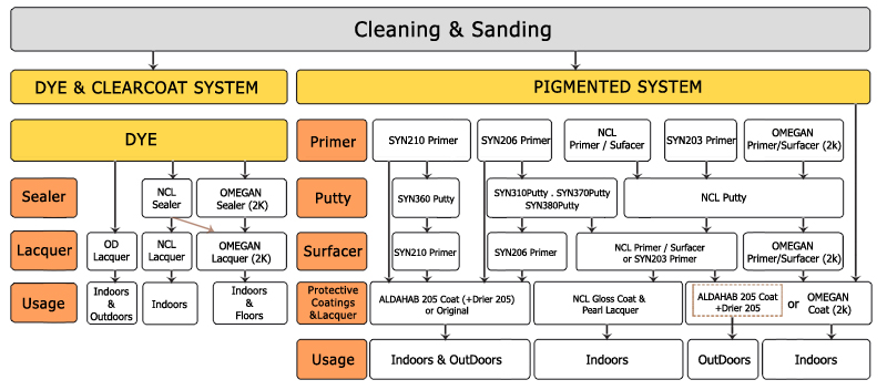 Different full paint systems are available as is shown in the substrate treatment of wooden surfaces diagram. The choice of a process for substrate treatment and coating depends on different factors such as interior or exterior use, furniture, flooring (parquet) etc…